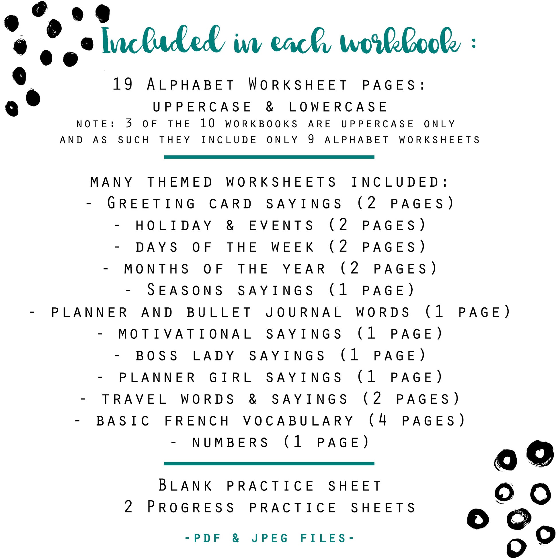 Each workbook contains 40 hand lettering practice worksheets: 20 Themed worksheets (see full list below) with traceable words + 19 Alphabet pages (upper and lower case) + blank practice sheet.