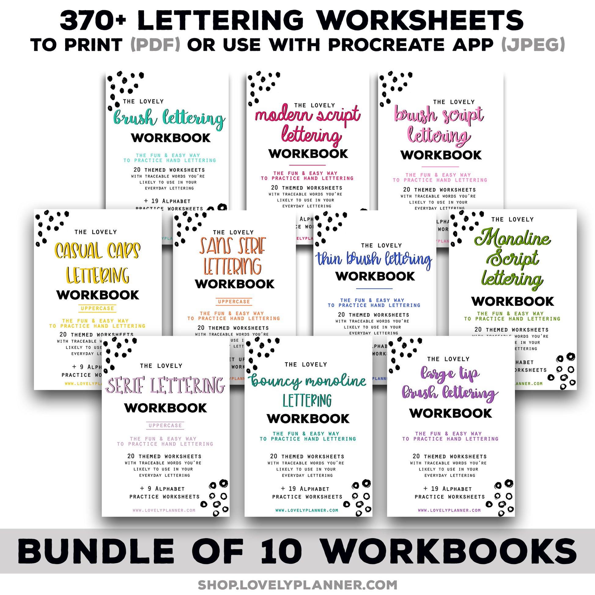 BUNDLE of 10 Lettering Workbooks with 370 Hand Lettering Practice Worksheets -Brush/Monoline for Procreate & Print, Modern Calligraphy, Ipad