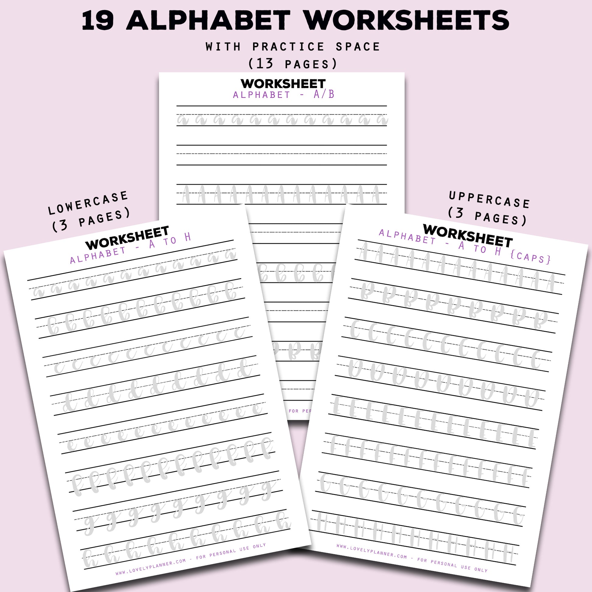 ►19 Alphabet Worksheet pages - lowercase and uppercase (note: Sans Serif Lettering workbook only contains Uppercase letters and includes 9 alphabet worksheet pages instead of 19 in the other workbooks)