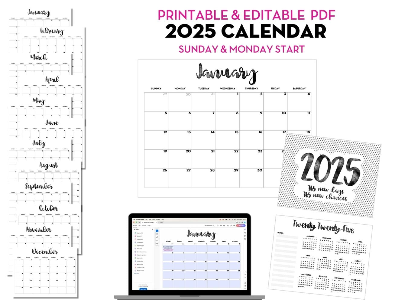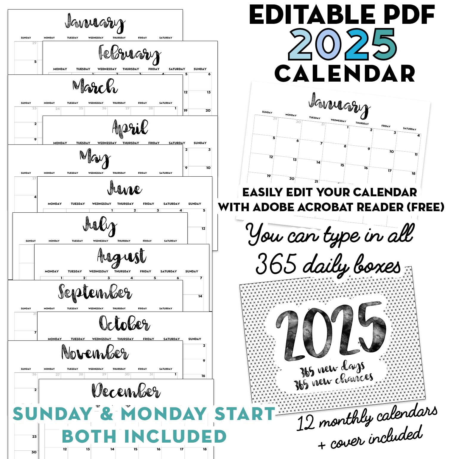 Printable 2025 Calendar in an editable PDF file with 12 monthly calendar pages to help you stay organized throughout the year.