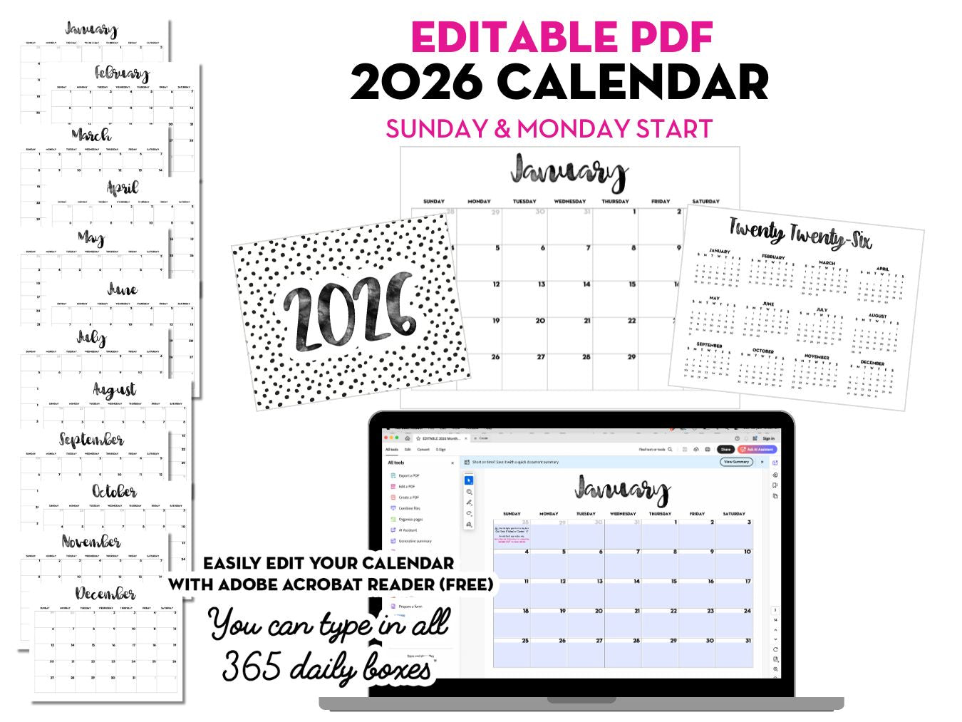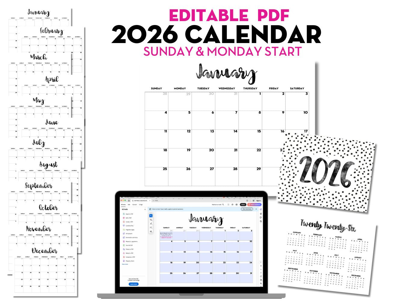 Printable 2026 Calendar in an editable PDF file with 12 monthly calendar pages to help you stay organized throughout the year.