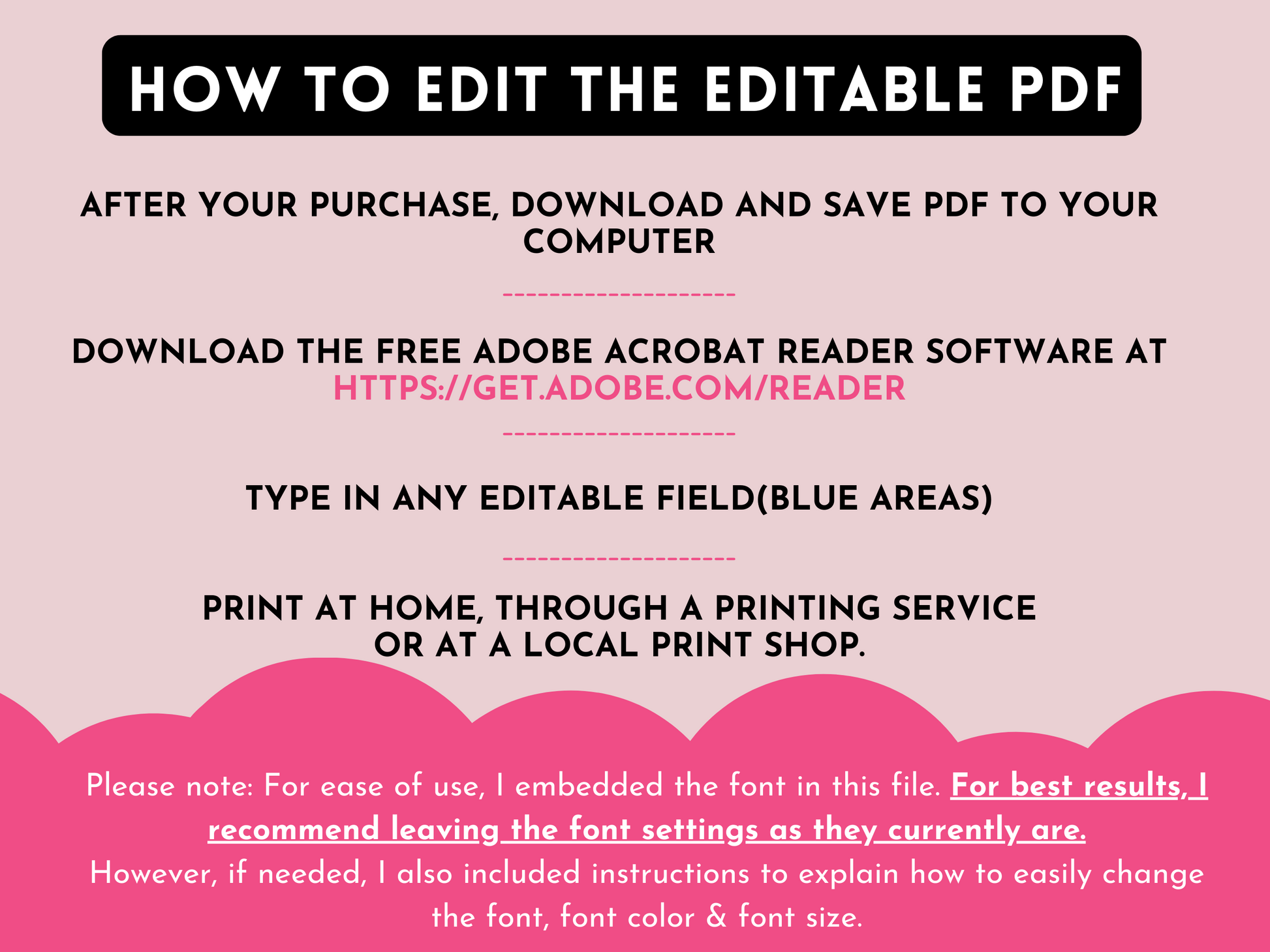 - Editable PDF - you can change and customize the text before printing it (using Adobe Acrobat Reader on your laptop - free)