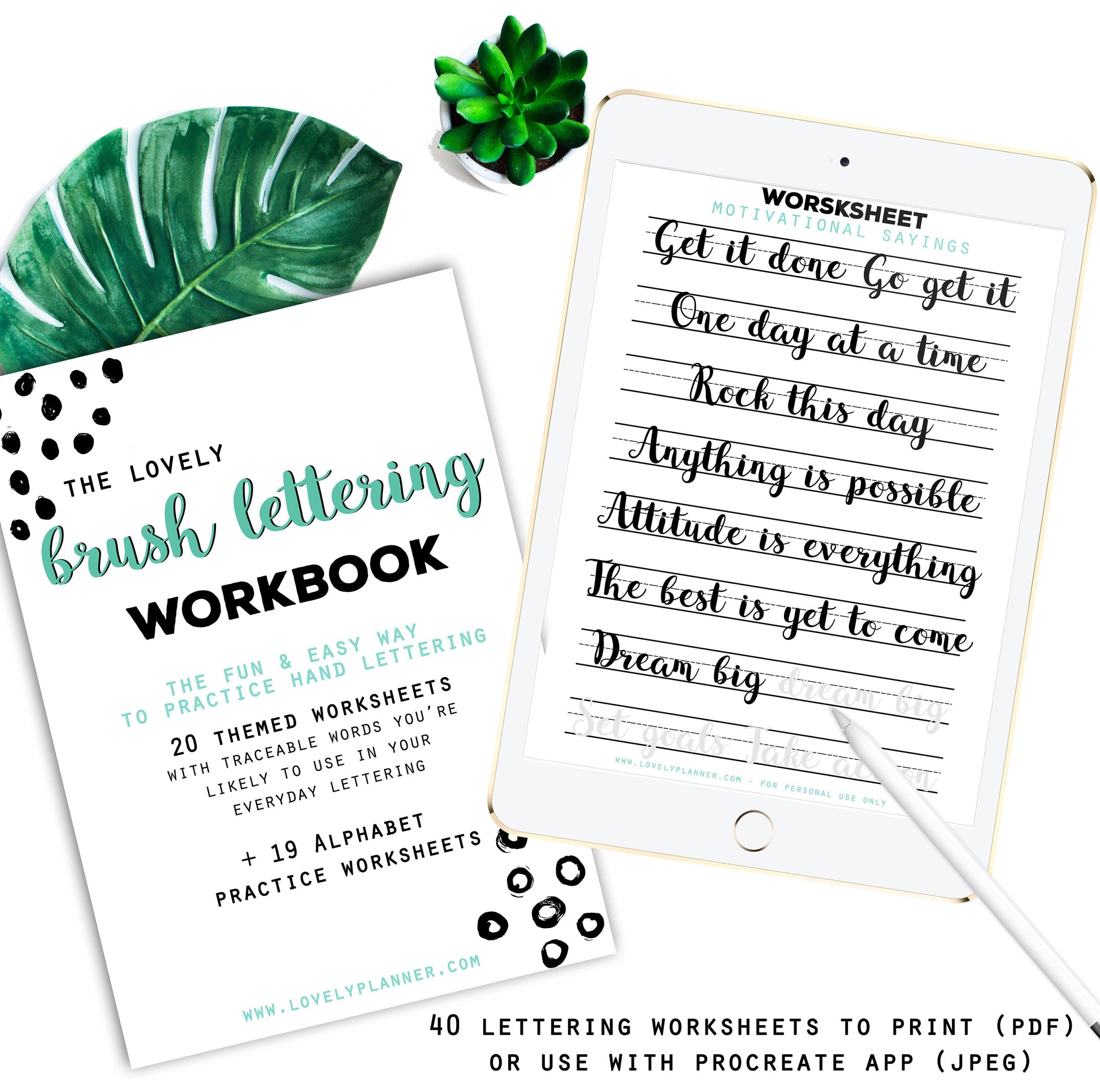 ►This Lovely Brush Lettering Practice Workbook includes more than 40 pages to help you get started or improve your hand lettering in a fun and easy way.