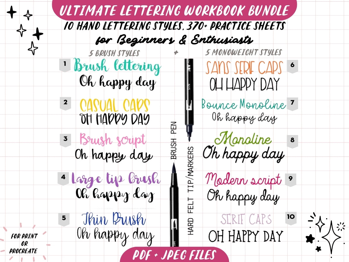 BUNDLE of 10 Lettering Workbooks with 370 Hand Lettering Practice Worksheets -Brush/Monoline for Procreate & Print, Modern Calligraphy, Ipad