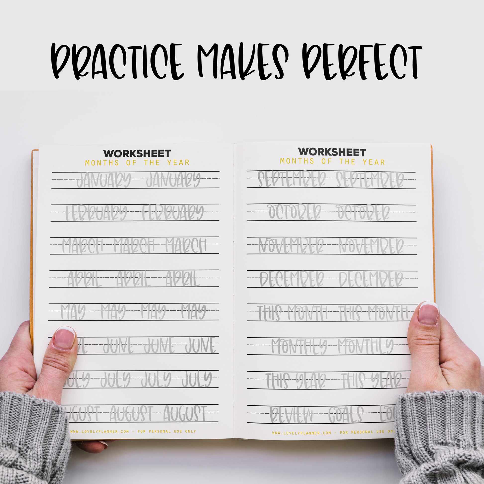 My themed worksheets with words and sayings will gradually teach you how letters flow together, and effortlessly help you master words you’d be happy to use to decorate your planners, notebooks,