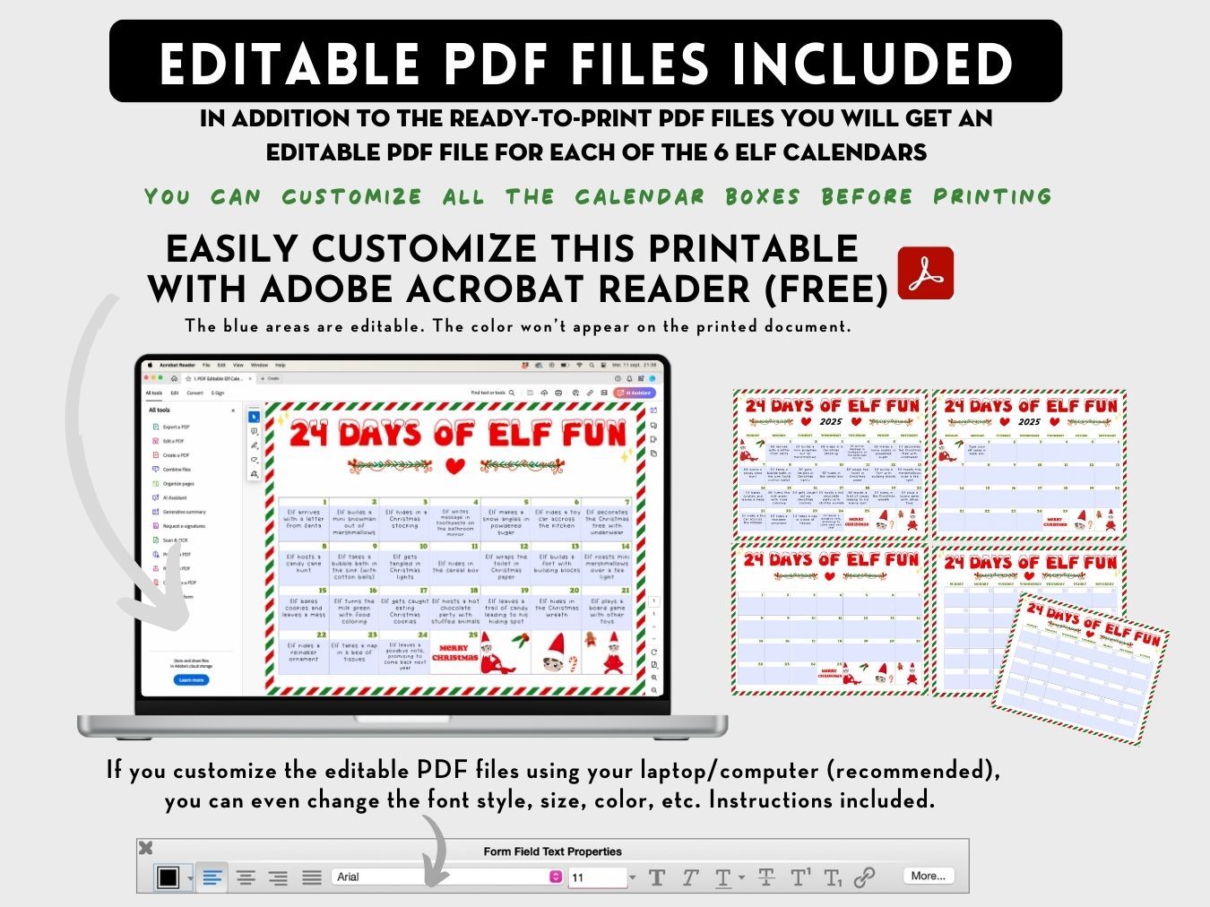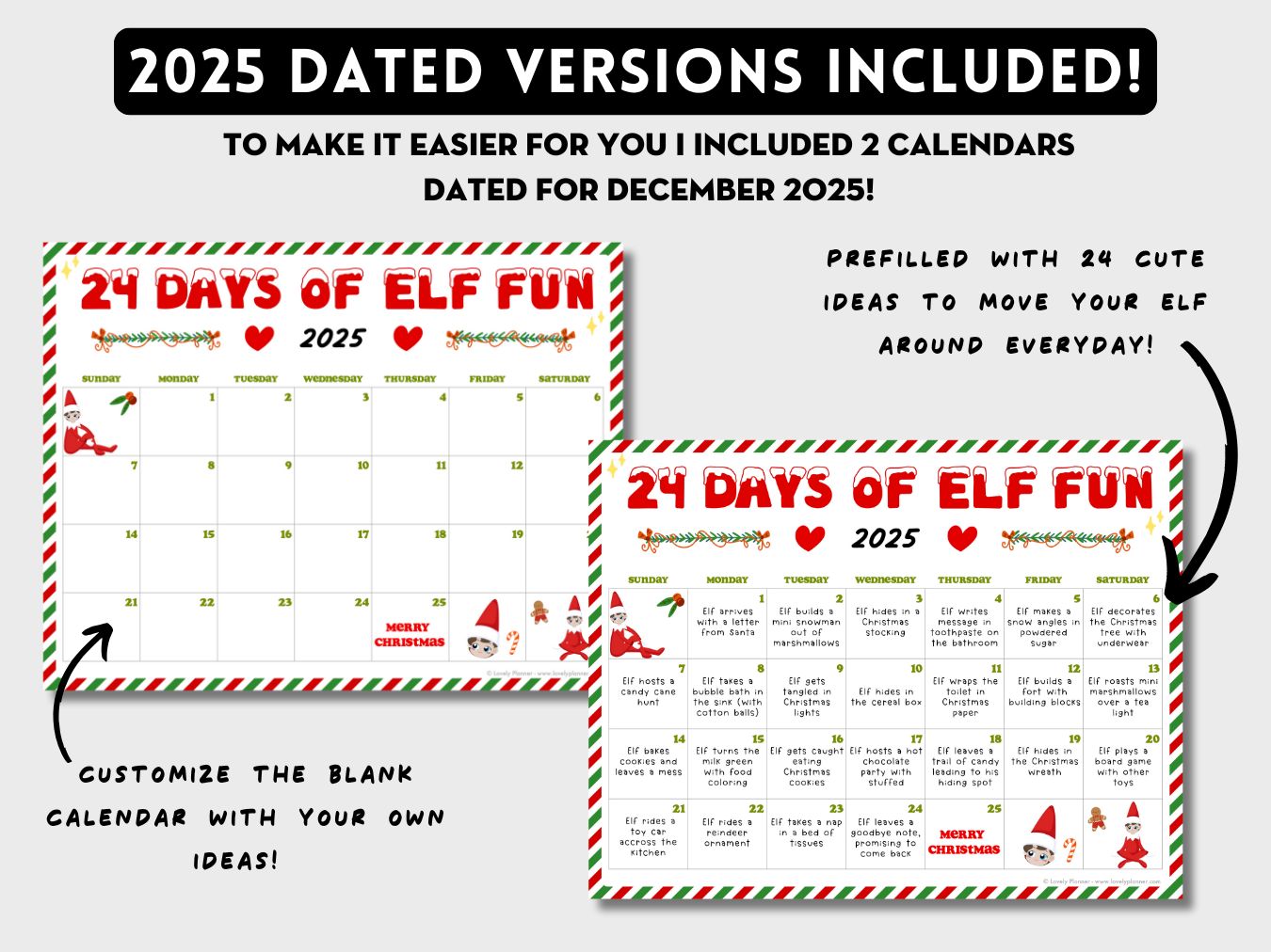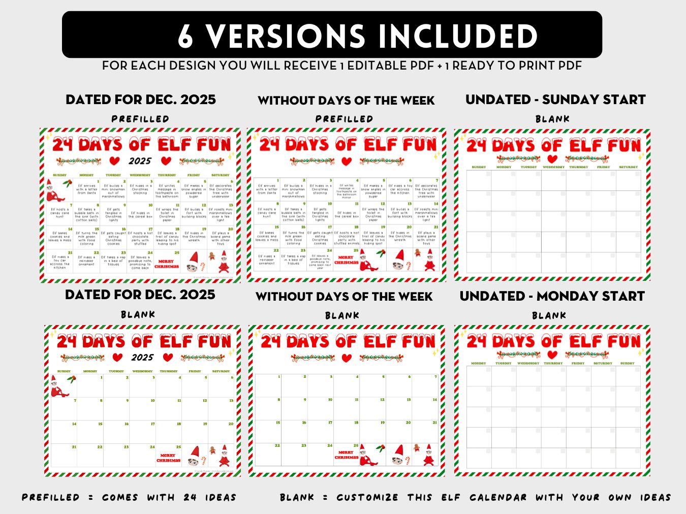 Editable Elf Calendar Printable - 6 Pages of Customizable Christmas Elf Ideas - 2025 Elf Ideas Calendar + Undated Elf Activity Calendar
