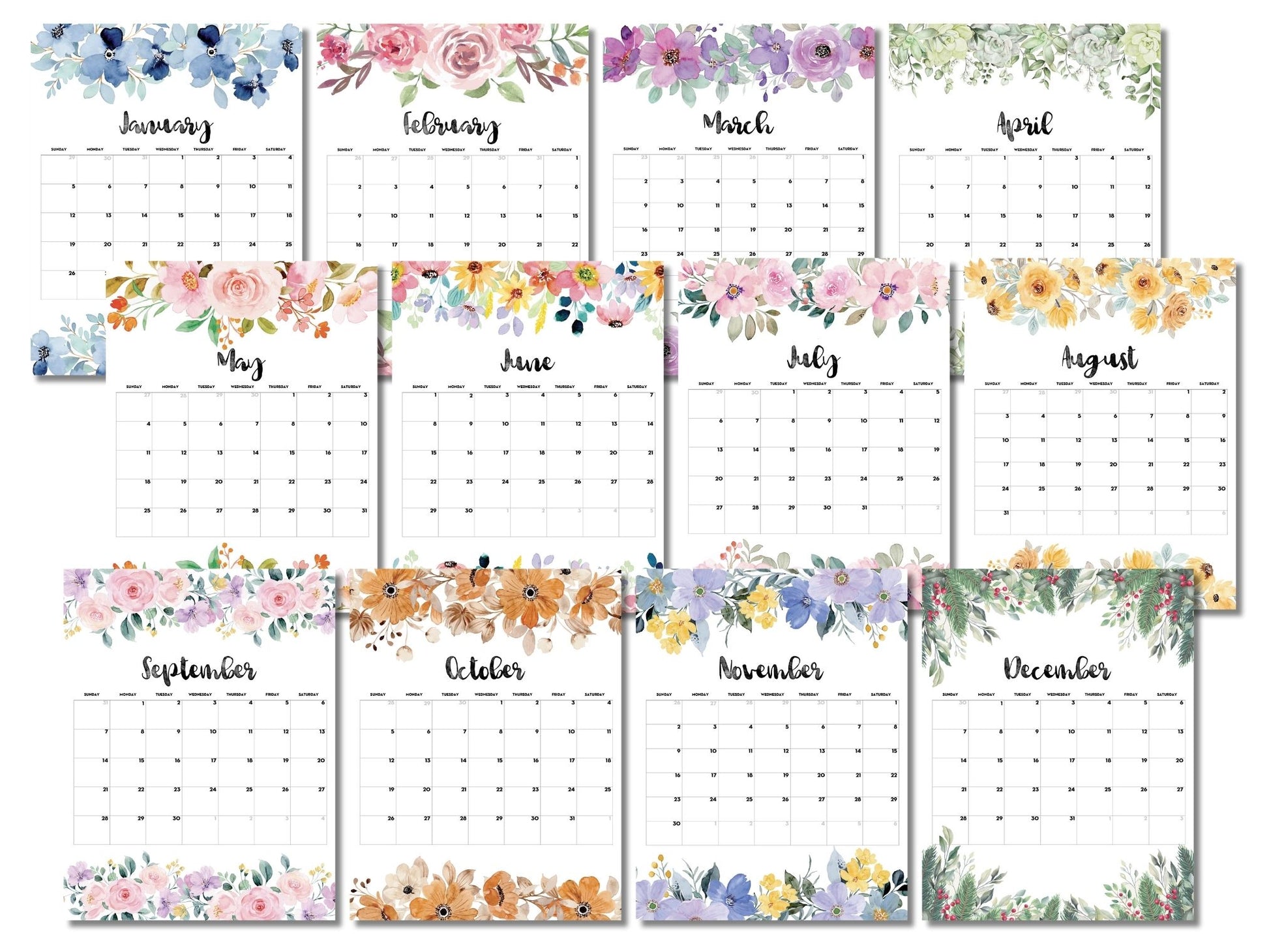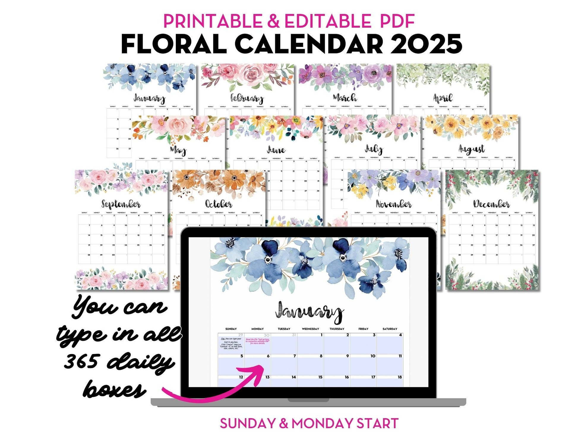Printable 2025 Floral Calendar in an editable PDF file format with 12 monthly calendar pages to help you stay organized throughout the year. Monday start and Sunday start versions are both included.