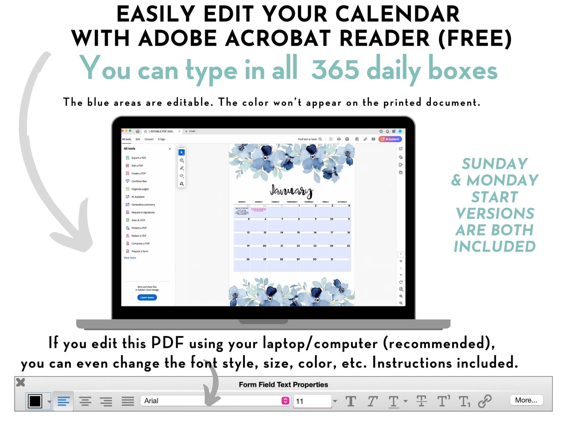 This 2025 calendar can be edited (using the free software Adobe Acrobat Reader) before being printed. You can customize the font & color of each text field. Instructions are included.