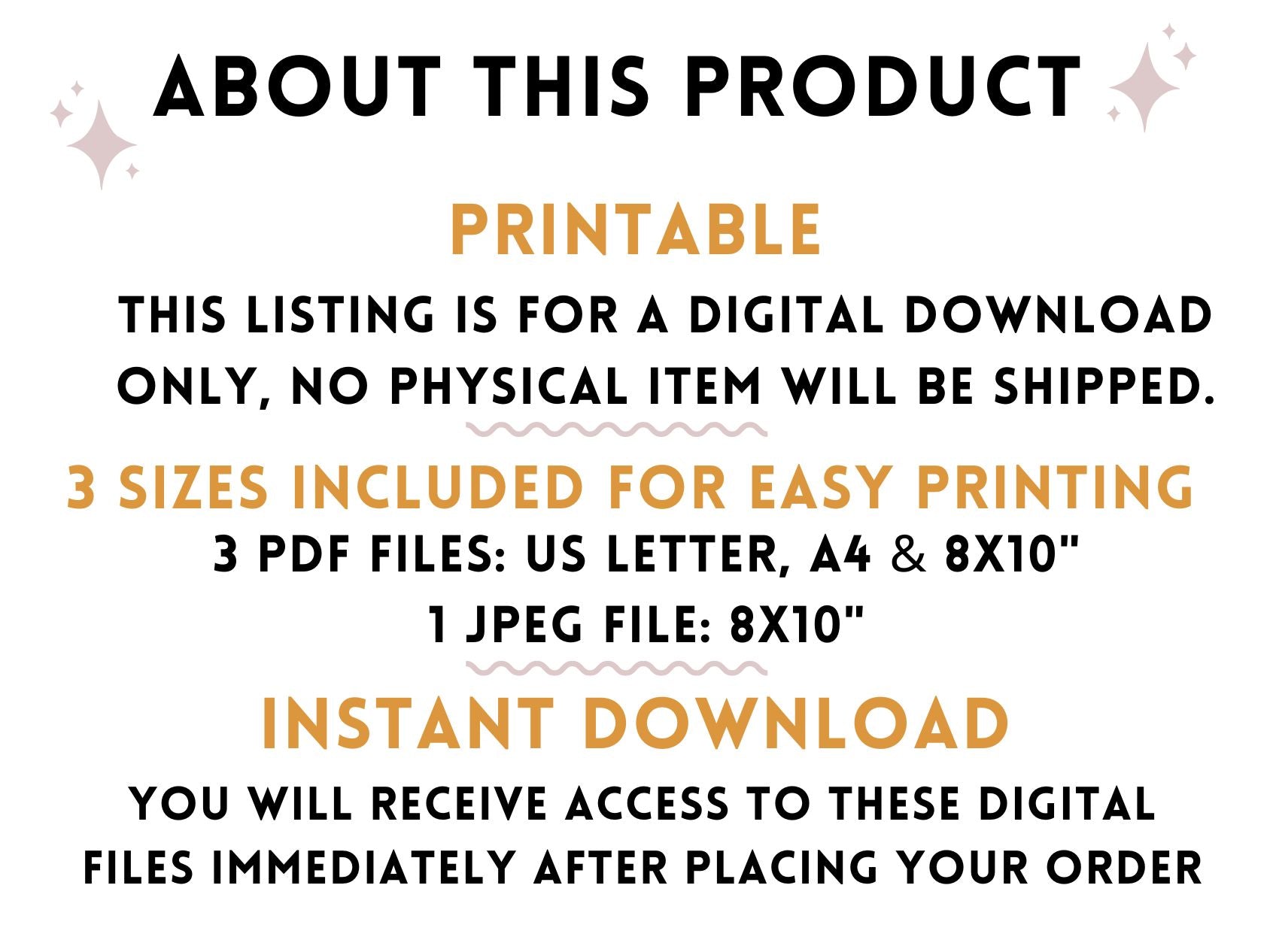 You'll instantly receive 3 PDF Files (3 sizes: US Letter, 8x10" and A4) and 1 Zip Folder with 9 JPEG files (8x10")