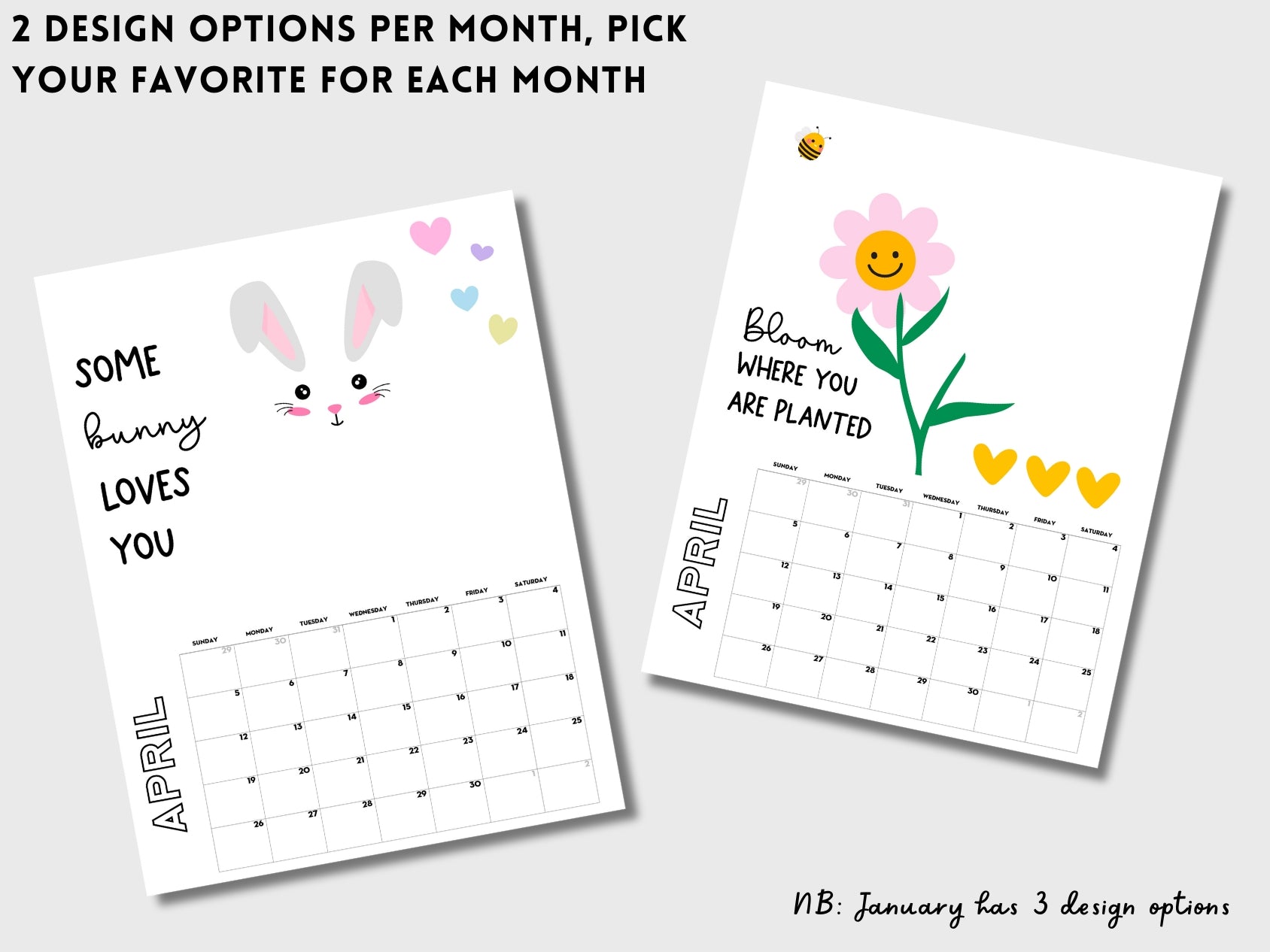 2 design options are available for each month (+ 1 yearly calendar).
