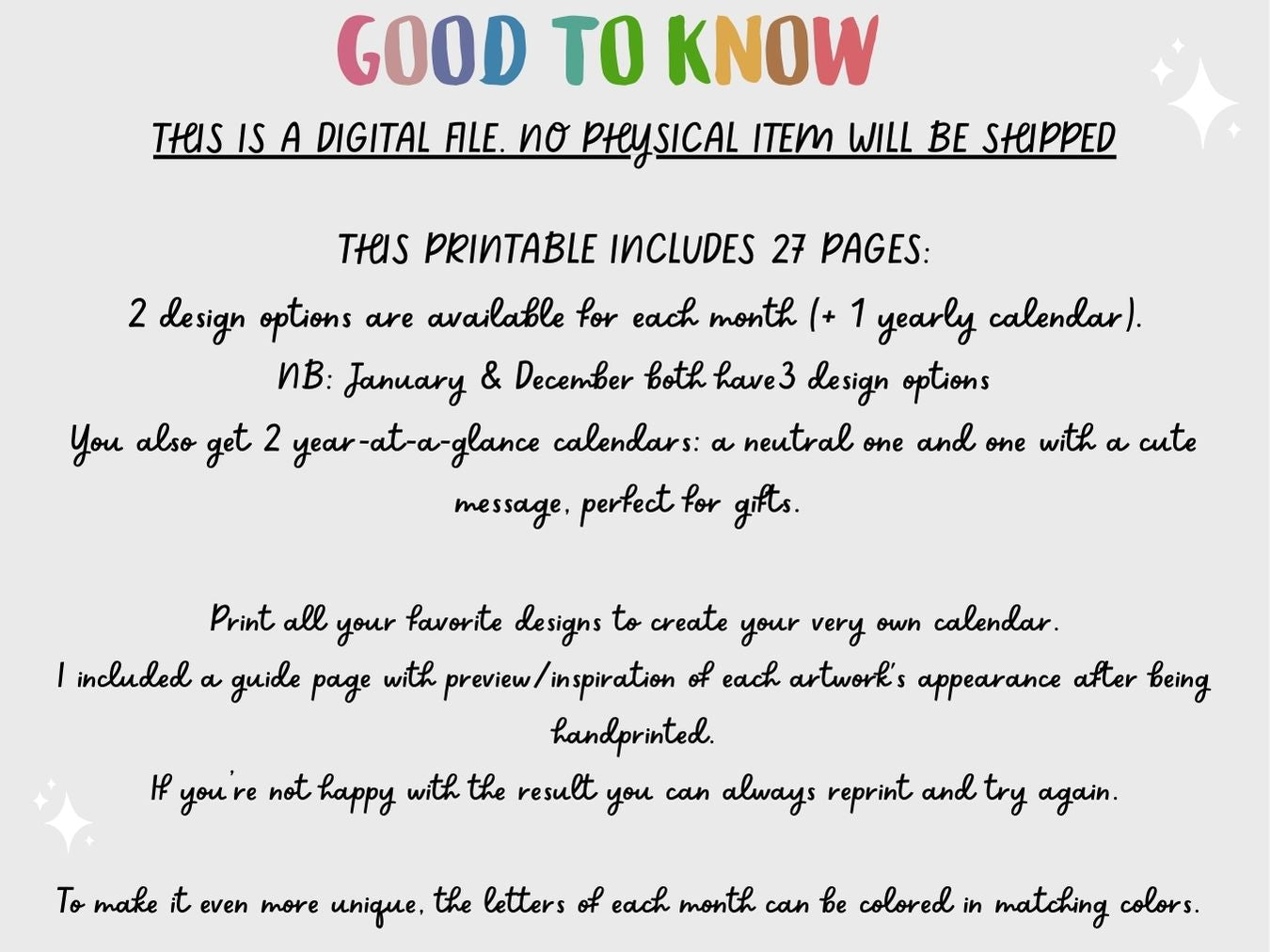 2x High-resolution PDF Files (31 pages - see images to get a preview of the pages included) - 1 file for the Sunday start calendar and 1 file for the Monday start calendar