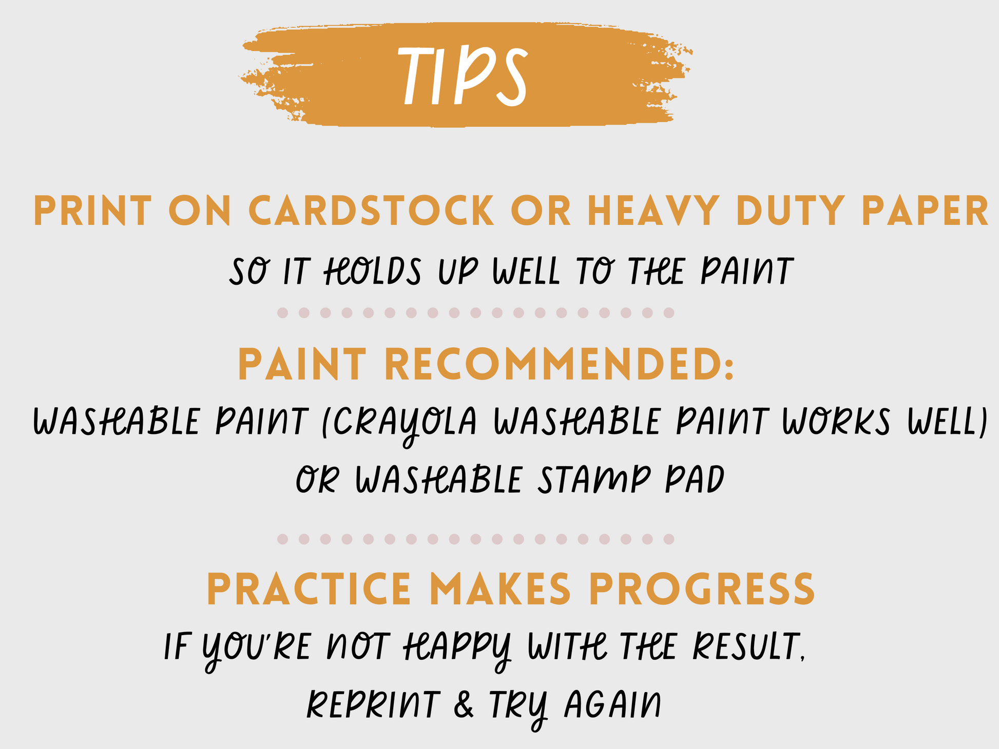 Once printed (cardstock or heavy-duty paper recommended), use washable paint or a washable stamp pad to stamp your child’s handprint in each artwork.