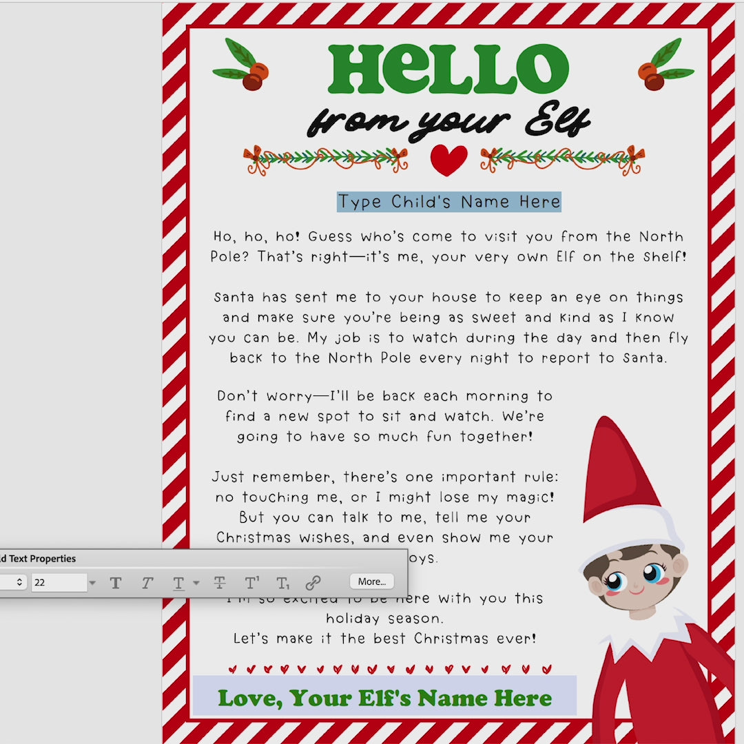 For ultimate convenience, these letters come in two formats: a ready-to-print PDF with no customization required, and an editable PDF where you can add your child’s name and your elf’s signature before printing. This makes it perfect for those who want a quick solution or those looking to add a personal touch. The editable files can be modified using Adobe Acrobat Reader (a free software).