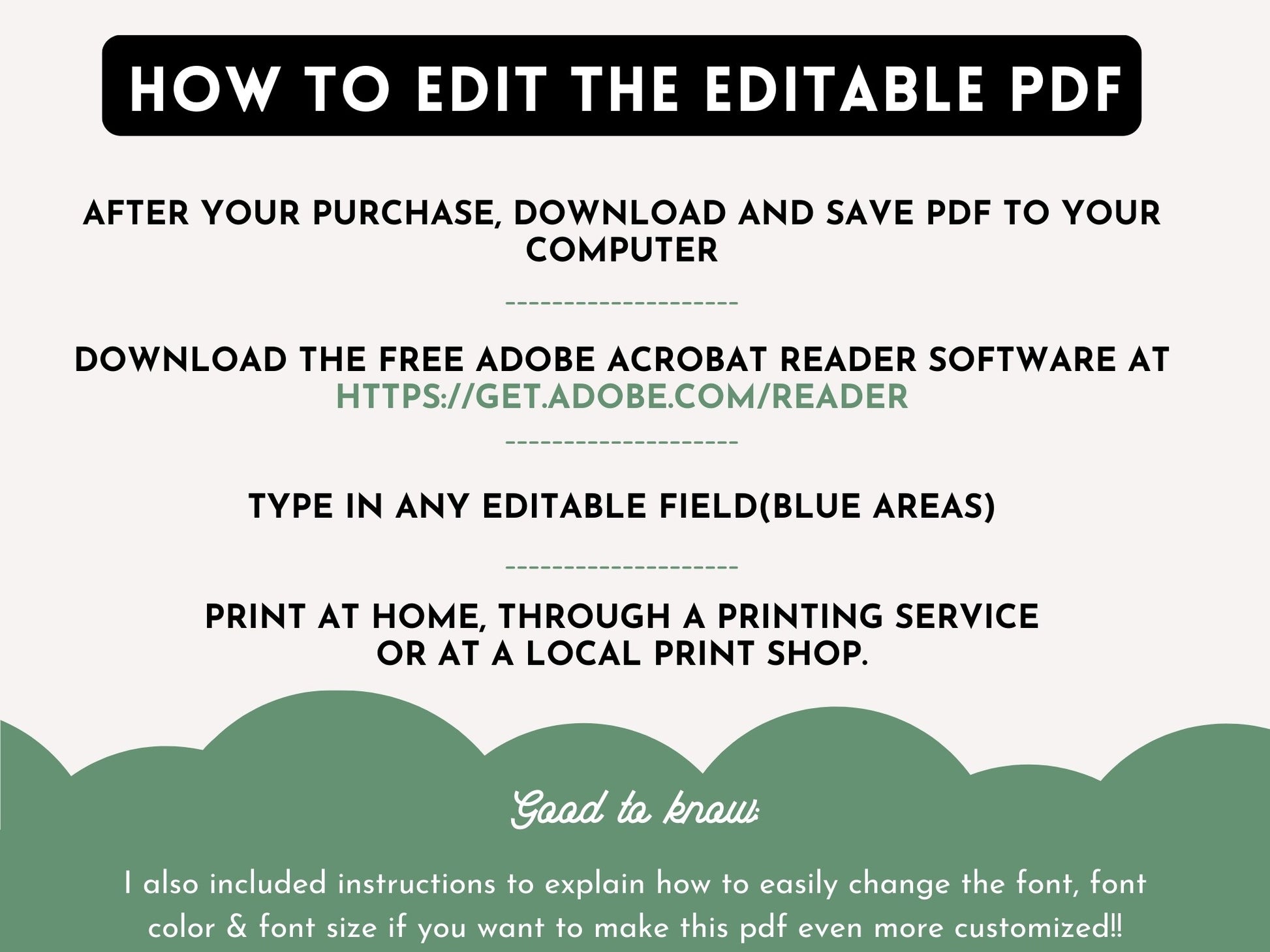 The Editable PDF files included contain editable text fields (highlighted in blue). To edit the PDF you will need the free Adobe Reader software installed on your computer, you can download it for free: https://get.adobe.com/reader/.