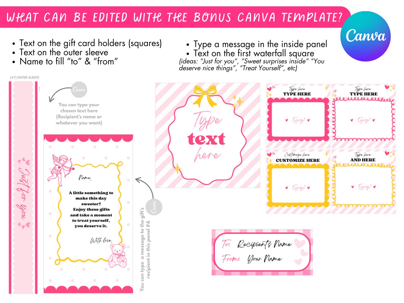✔ Editable Canva Template — optional! Customize your card with the recipient’s name, your own messages, and personalized text on the card holders and cover.