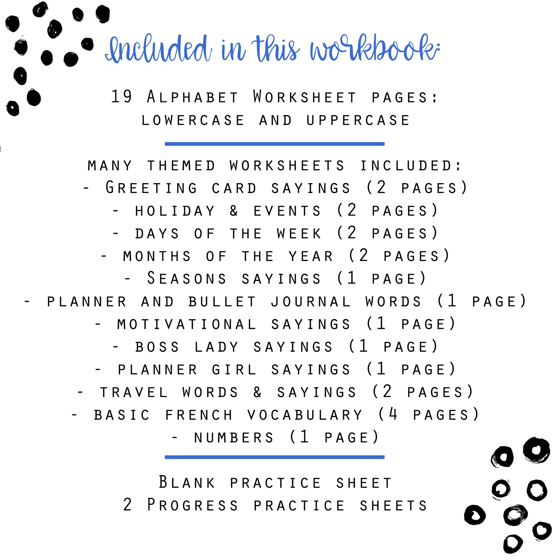 The document also includes a blank worksheet, as well as 2 progress worksheets to compare your hand lettering before and after completing the workbook.