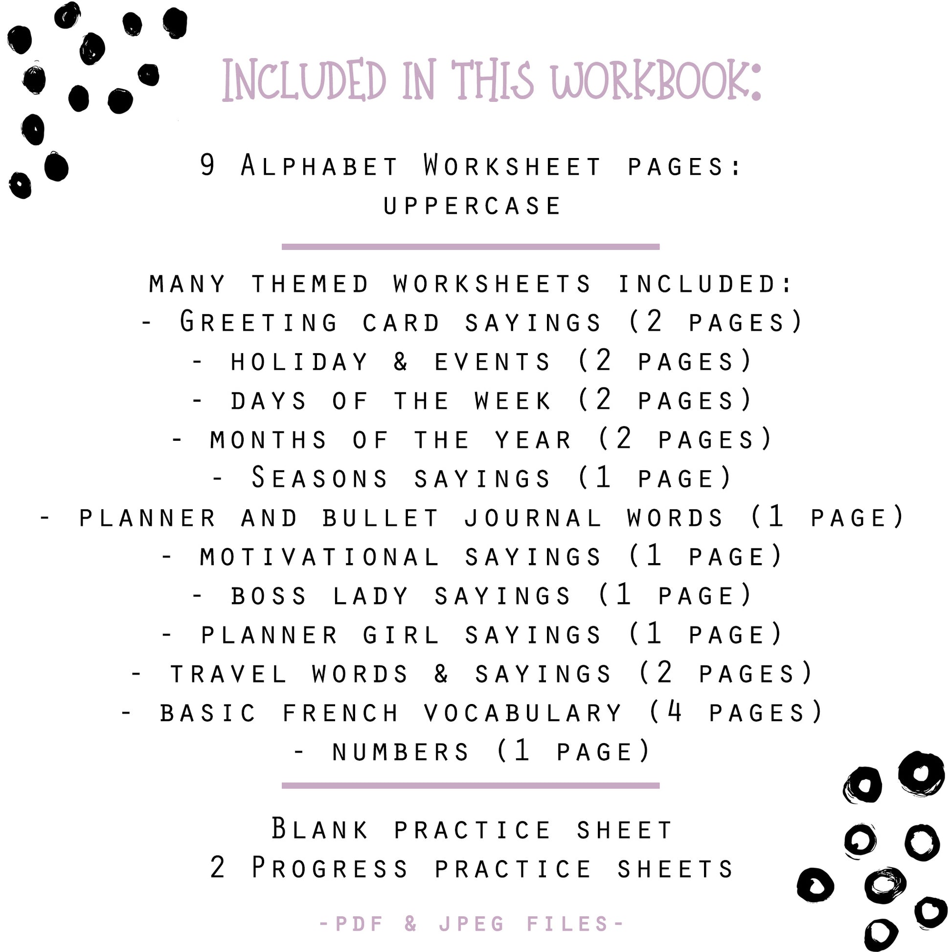 ►This Lettering Practice Workbook includes 30 pages to help you get started or improve your hand lettering in a fun and easy way.