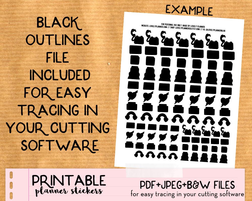 Cute Printable Kawaii Planner stickers, print and cut stickers for Happy Planner, Filofax, Erin Condren - PDF, JPEG and Black and white file for easy tracing in Silhouette