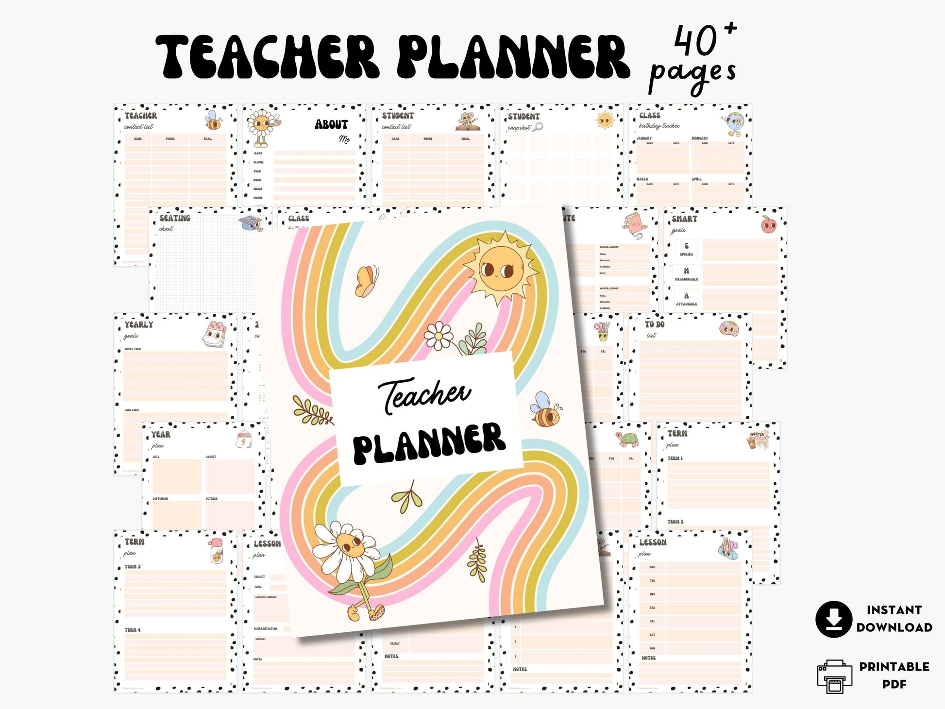 Comprehensive Printable Teacher Planner with more than 40 cute printable pages to help you easily organize your school year!- Download instantly after purchase and print as many times as you need! It's undated so you can reuse these 40 planner pages every year!