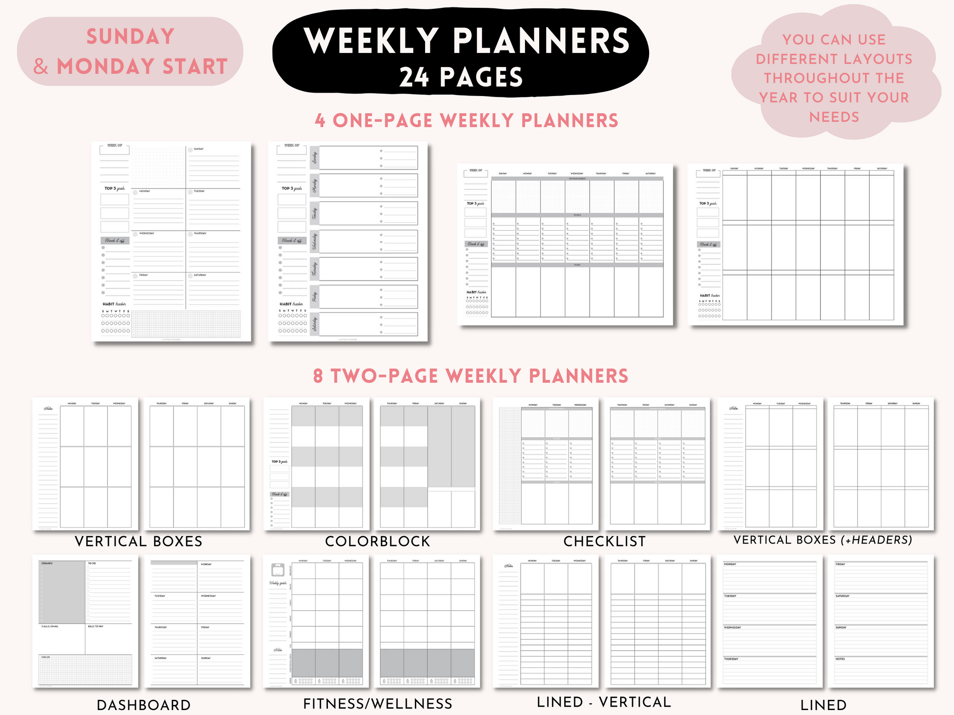 - 12 different planner layouts are included in this bundle: vertical boxes, vertical lined, horizontal, fitness & health, checklist, dashboard, student, monthly. It's a perfect way to try out different planner layouts to help you decide which one works best for you.