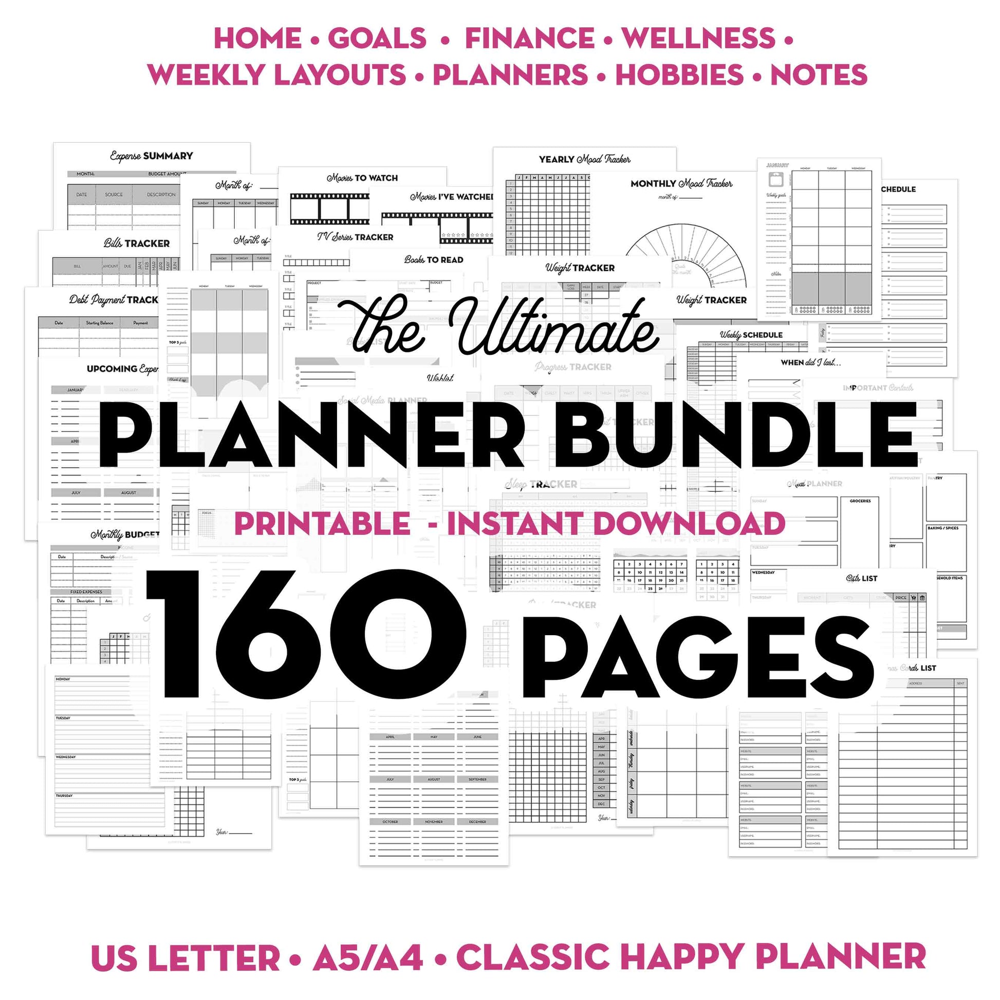 Ultimate Planner Bundle - 160 Printable Planner Inserts for A5, US Letter, Classic Happy Planner