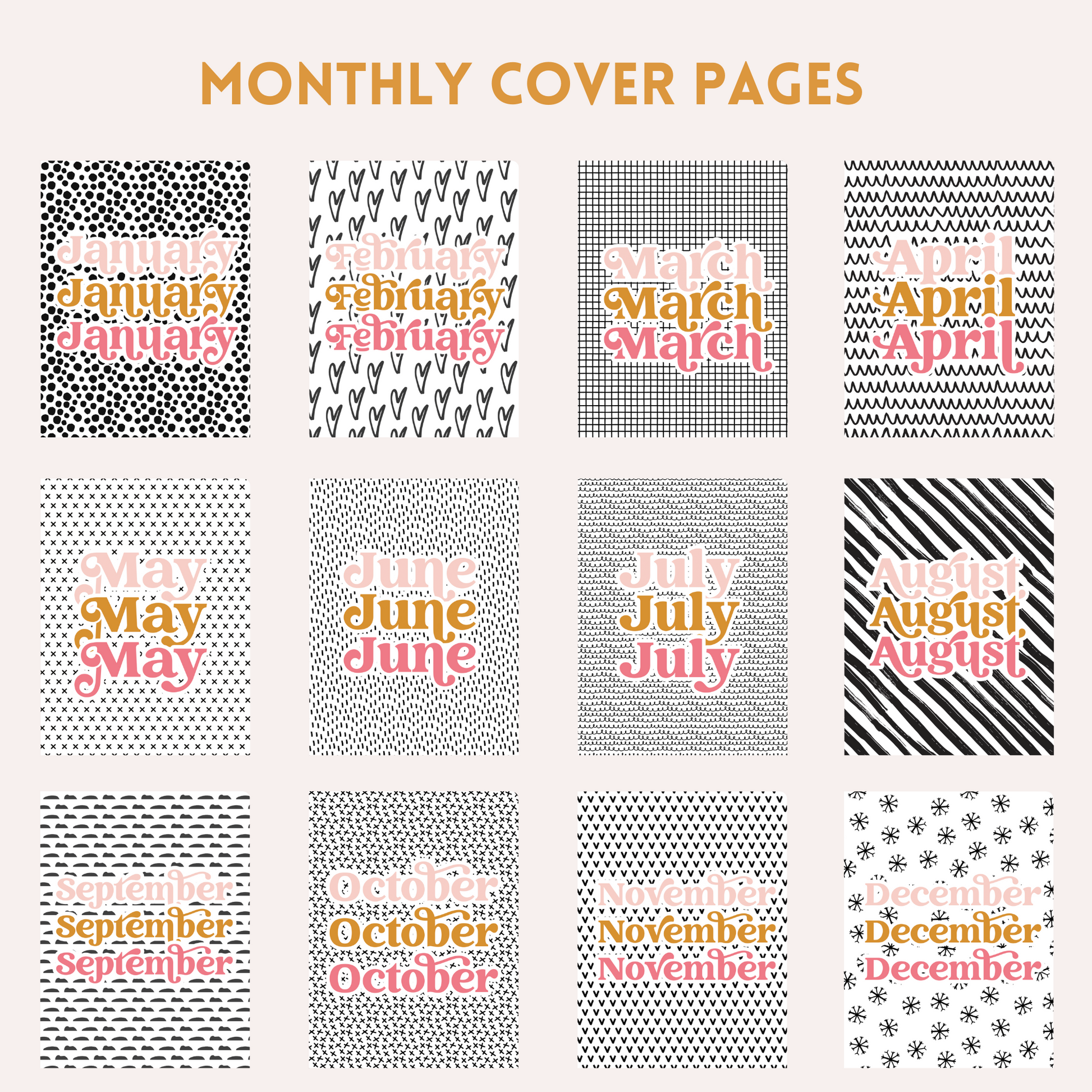 ➔ Black & white pages design: the pages don’t include any color (only the tabs & dividers do), so it’s easy for you to customize your pages with your own stickers and style.