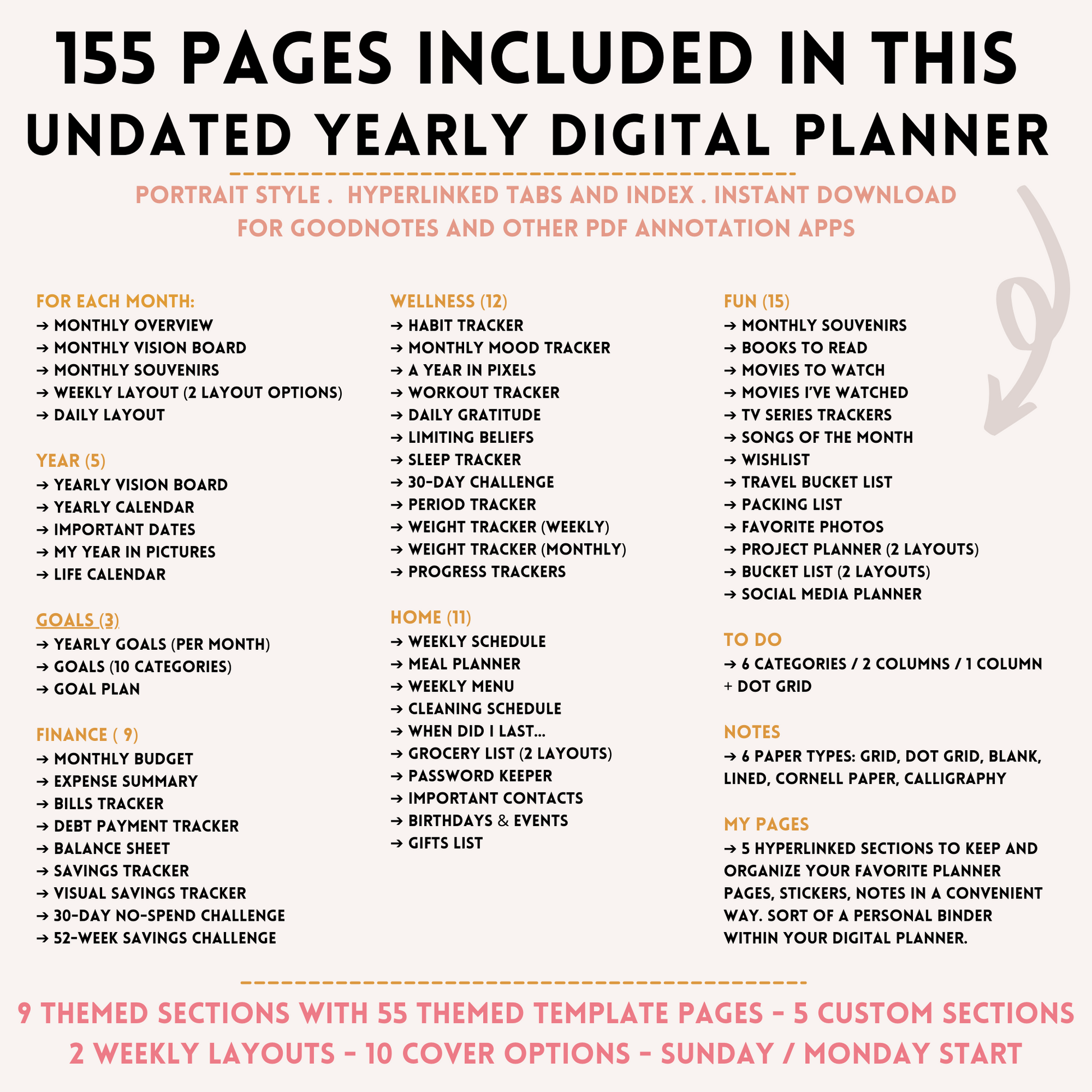 This digital planner includes 155 pages and is fully hyperlinked to help you navigate through it easily.